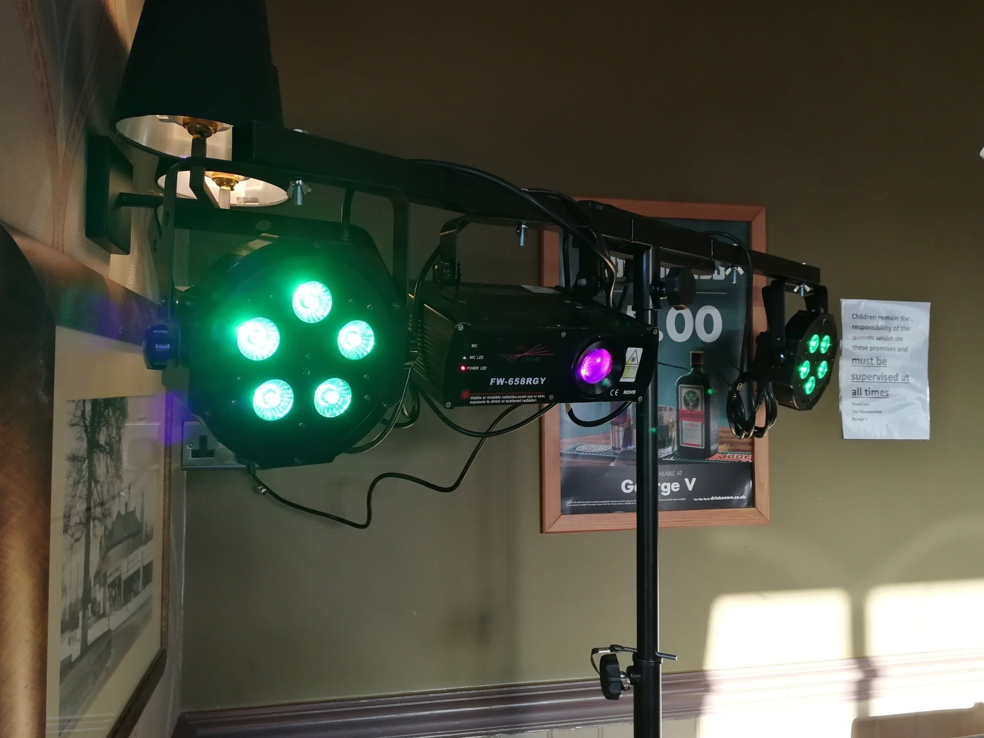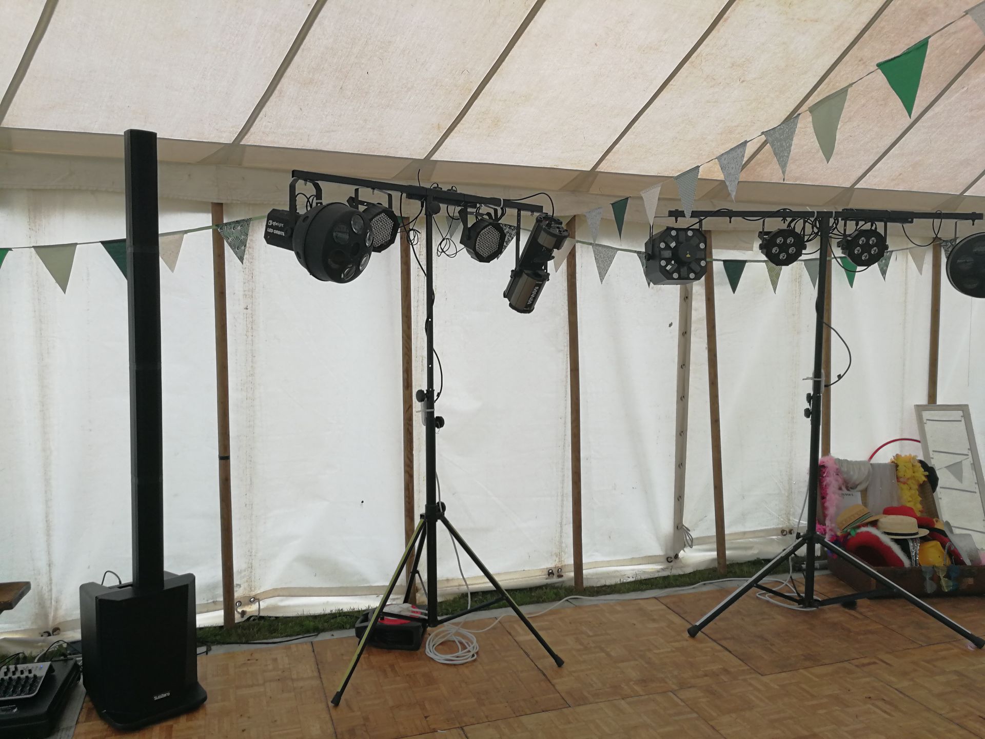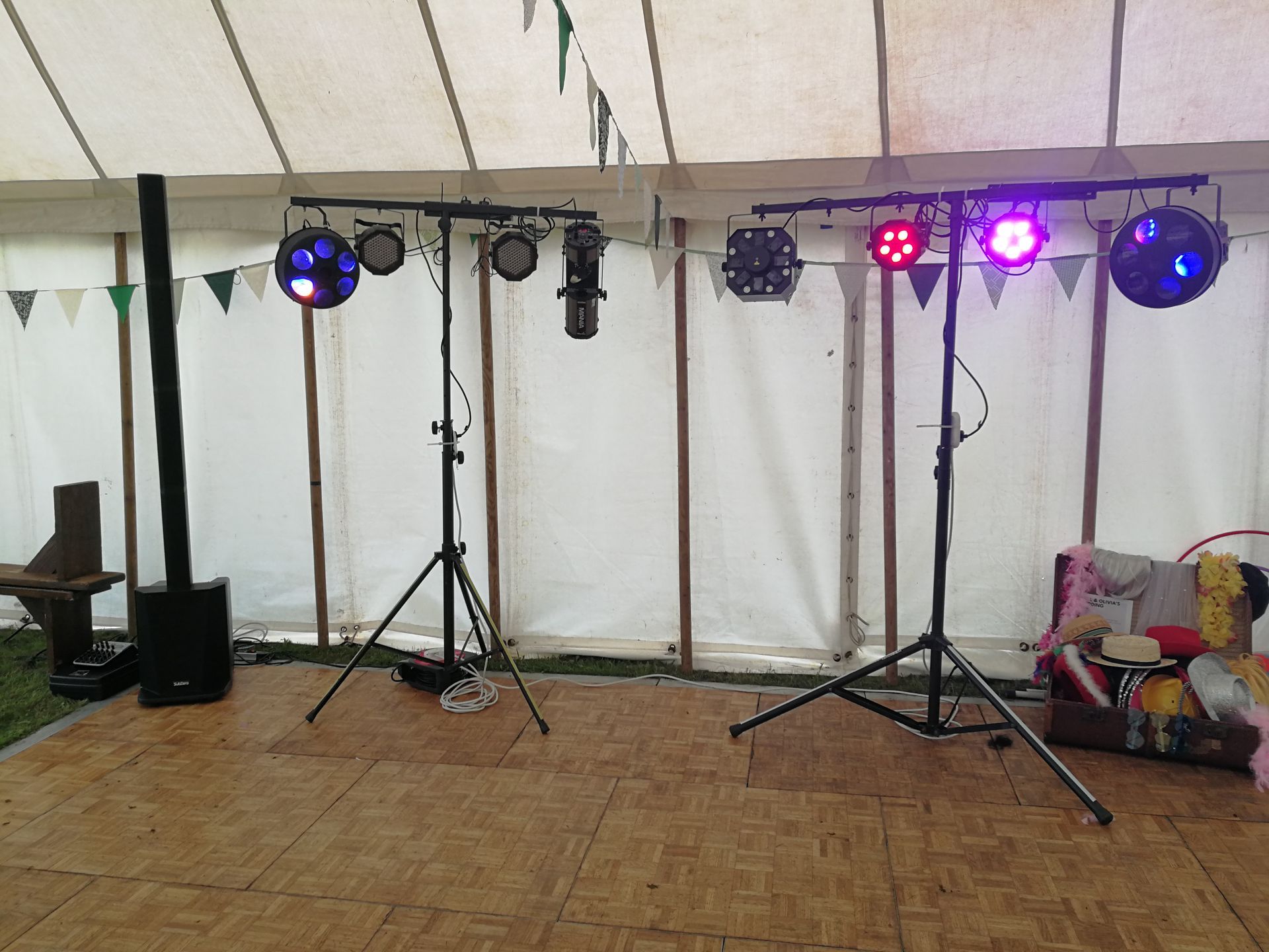 - Two T-stands with different DJ lights on including, laser, scanner, par LED lights, radial lights and more.